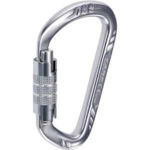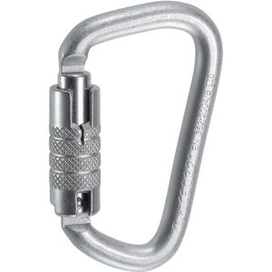 Mosquetão de aço de alta resistência. A forma de D o torna particularmente bom para uso com nós. Certificação ANSI e CSA com resistência à porta de 16 kN / 3600 lbs. O fechamento do bloqueio evita o atrito durante o uso. O bloqueio automático requer três ações para abrir: deslizar, girar e puxar.