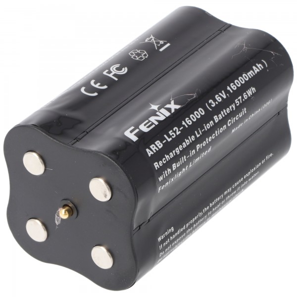 A bateria Fenix ARLB-52 original como bateria para a nova lanterna LED Fenix LR50R. Ofereça ao seu LR50R de alta qualidade esta energia extra com a bateria original, ideal como segunda bateria ou bateria de reposição. Fenix ARB-L52-16000 3,6 V, 16000mAh bateria de íon-lítio recarregável 57,6Wh com circuito de proteção integrado Fenixlight Limited Fabricado na China.