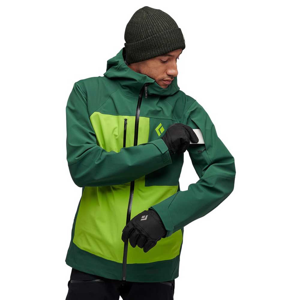 Esta roupa Black Diamond apresenta tricô de 4 vias que se adapta ao seu corpo para permitir liberdade de movimento. O sistema de armazenamento deste modelo inclui bolsos frontais cruzados no peito, bolsos internos de malha e um passe de esqui na manga esquerda. Ele também inclui um capuz compatível com capacete ajustável.