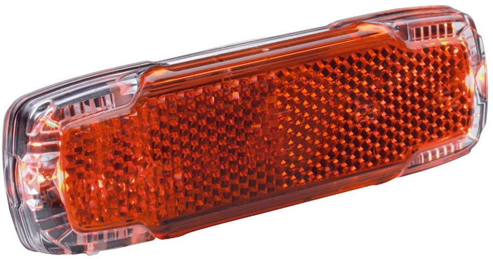 A luz traseira é aprovada pela StVZO, possui um refletor integrado de área Z de grande campo e pode ser facilmente montada no bagageiro. Graças aos seus dois vidros transparentes em forma de C, à esquerda e à direita, que brilham como faixas de luz intensa, é particularmente visível no tráfego rodoviário e, portanto, seguro.