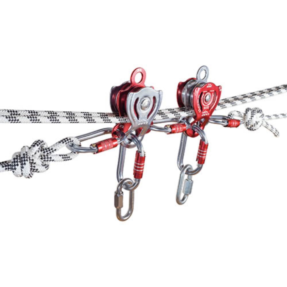 Polia dupla multifuncional de alta resistência para sistemas de roldanas e contrapesos e operações complexas. Possui rodas grandes, um ponto de fixação principal que acomoda três mosquetões e um grande suporte com um grande ponto de fixação inferior e dois pontos de fixação secundários nas laterais para vincular, posicionar e conectar sistemas de captura de progresso. Para uso com cordas de até 16 mm. Para Prusik, o nó de travamento automático pode ser instalado nos dois lados das duas rodas. Buchas auto-lubrificadas são suficientes para aplicações leves em baixa velocidade.