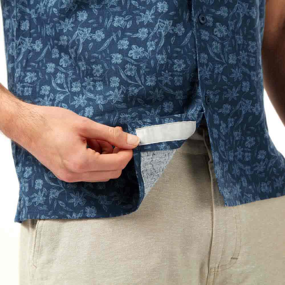 Comemore o início de uma nova temporada de caminhadas e viagens com esta camisa de manga curta descontraída. O tecido leve de linho e algodão apresenta tratamento anti-inseto Nosibotanical baseado em plantas para repelir insetos picantes (para até 15 lavagens). Escolha entre uma seleção de impressões vibrantes de verão.