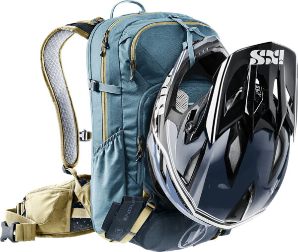 Além disso, a mochila da bicicleta permanece firme graças à abordagem do quadril alto nas costas, mesmo em descidas difíceis. O transporte de passagens facilita o transporte de guarda e em subidas suadas capacete e protetores são fáceis de prender na parte externa da mochila.
