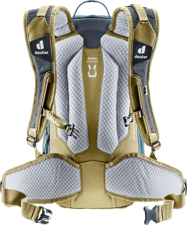 As almofadas traseiras projetadas ergonomicamente no sistema de contato envolvem as costas e distribuem a carga uniformemente. A ponta mais pesada, que fica perto das costas, também facilita o transporte. Os canais de ventilação entre as almofadas e o 3D AirMesh respirável garantem uma ventilação agradável.