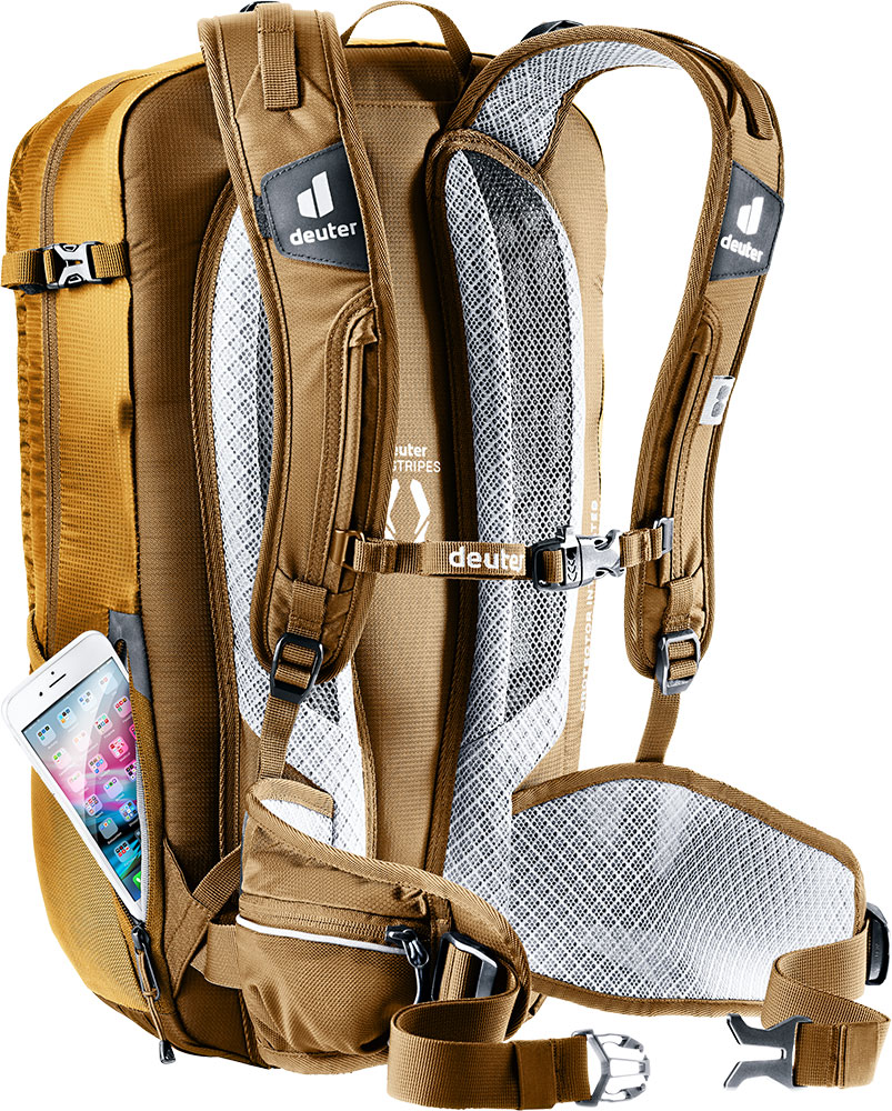 E, claro, há o protetor traseiro certificado pela TÜV/GS que é fácil de remover e oferece segurança máxima para quando as coisas dão errado. O sistema traseiro deuter Airstripes no Flyt oferece excelente ventilação nas costas.