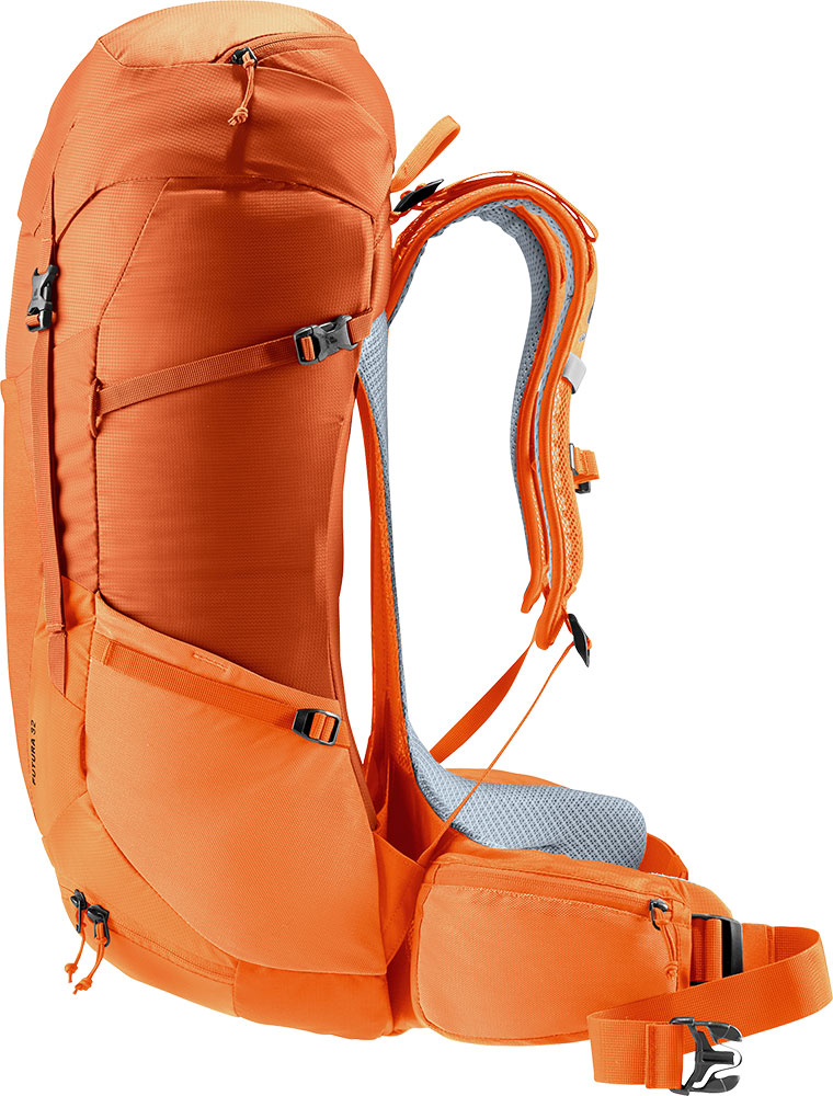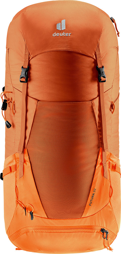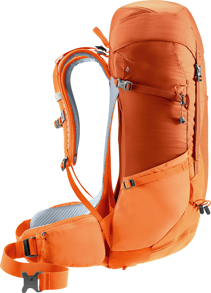 Máxima ventilação, conforto ergonômico e leveza são combinados neste novo sistema de malha nas costas. A construção inovadora da seção da barbatana do quadril e sua transição suave para a malha traseira literalmente envolvem o usuário e garantem um ajuste confortável. A construção flexível da estrutura feita de aço de mola permanentemente elástico e resistente a quebras dá à malha traseira do Aircomfort sua tensão estável. Ele cria de forma confiável um espaço de ventilação entre a mochila e as costas, através do qual o ar úmido escapa sem impedimentos. Com a ventilação de 3 lados patenteada Deuter, o usuário sua até 25%* menos. A alta flexibilidade de toda a construção dá ao usuário liberdade de movimento.