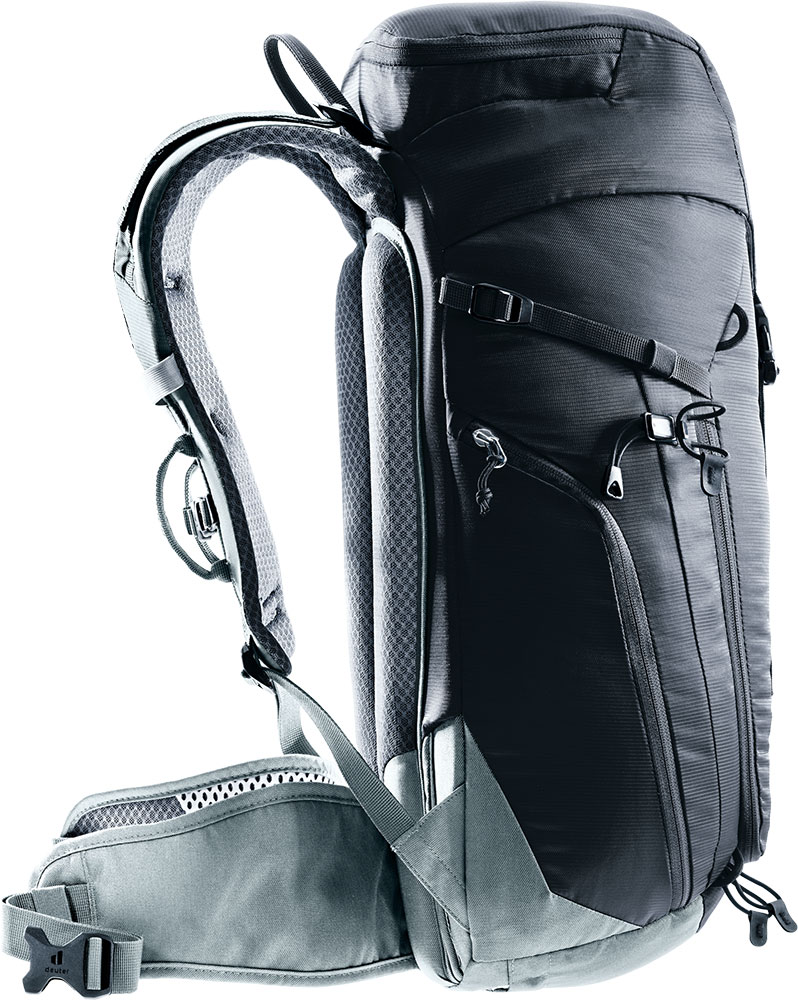 Garantido com a construção de contato traseiro com estrutura de aço de mola permanentemente elástica leve. Mantém o peso da carga compacto e próximo às costas e, portanto, próximo ao centro de gravidade do corpo. Ao mesmo tempo, as costas são agradavelmente ventiladas com as almofadas Aircontact de poros abertos e o canal de ventilação.