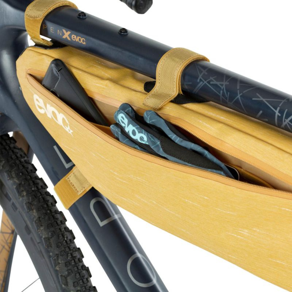 O conveniente pacote de quadro EVOC para o tubo superior oferece armazenamento extra em sua próxima micro aventura.