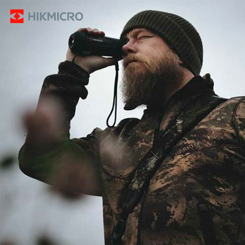 Monóculo térmico com sensor de imagem de 256 x 192px, NETD menor que 35mK, alcance de pixel de 12μm, lente de 15mm, display LCOS de 720 x 540px, alcance de detecção de 708m e conexão Wi-Fi para controle remoto via aplicativo Hikmicro Sight.