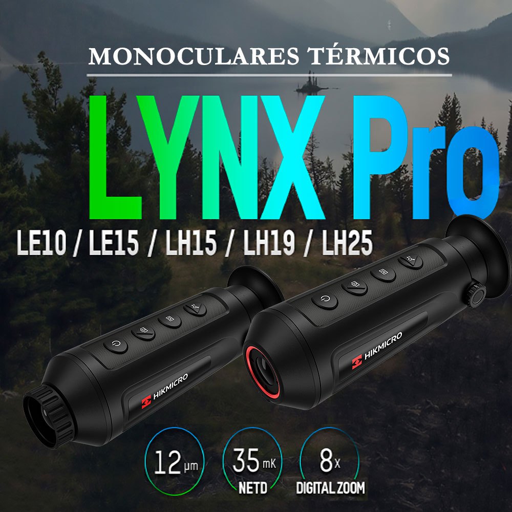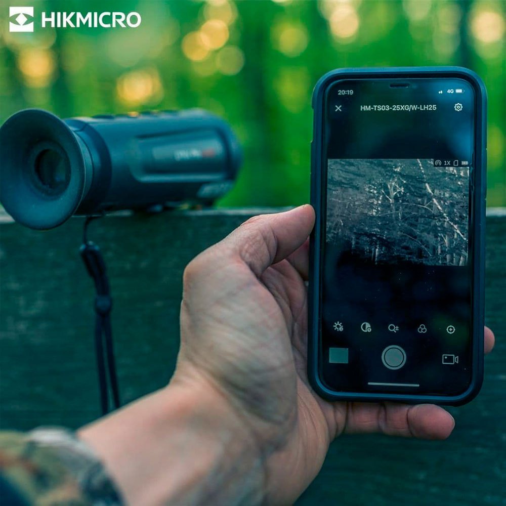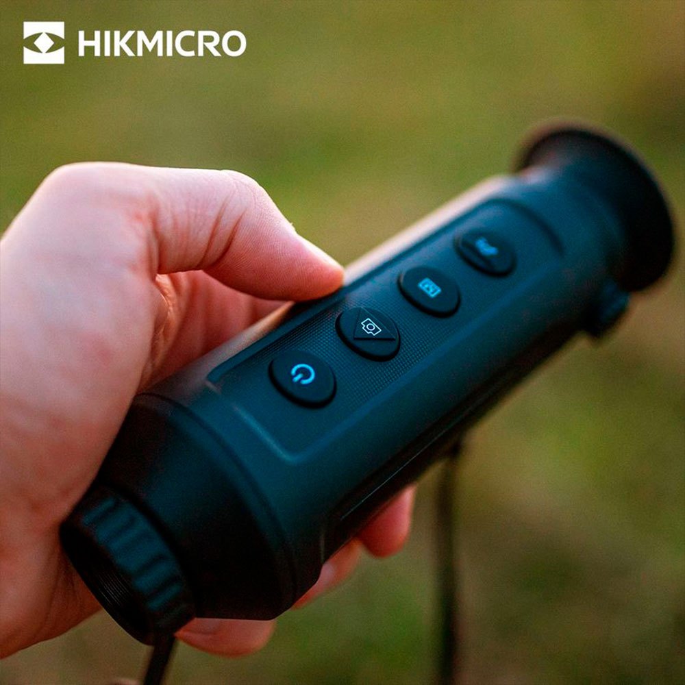 Monóculo térmico com sensor de imagem de 384 x 288 px, NETD menor que 35 mK, alcance de pixel de 12μm, lente de 25mm, display LCOS de 1280 x 960 px, alcance de detecção de 1180 metros e conexão Wi-Fi para controle remoto via aplicativo Hikmicro Sight.