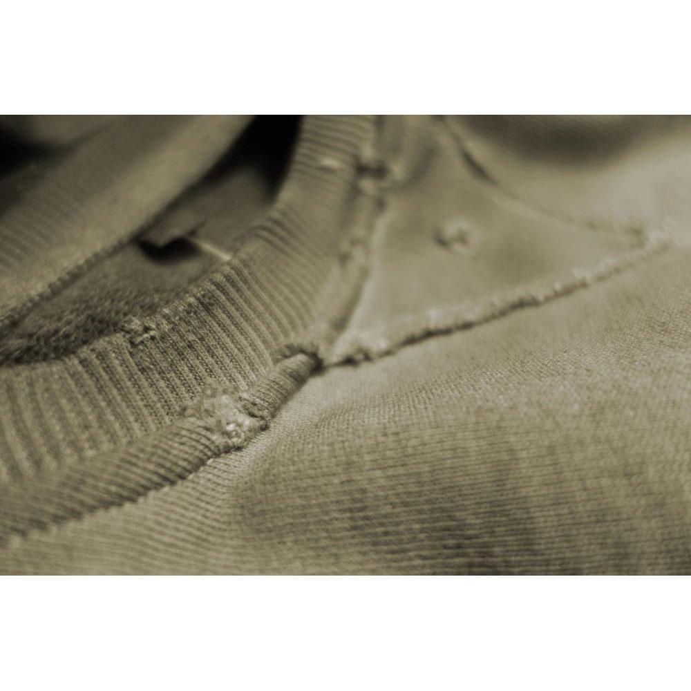 Esta camisola foi especialmente tratado com uma técnica de tingimento reativa a obtenção de cores que são exclusivos para uma autêntica viveu no olhar e sentir, a descoloração tem diferentes tons que colocam em evidência vários detalhes mais escuros como nos cotoveleiras, patches frontais, gola redonda, com nervuras bainha e punhos, um produto que só vai ganhar mais personalidade com o tempo.