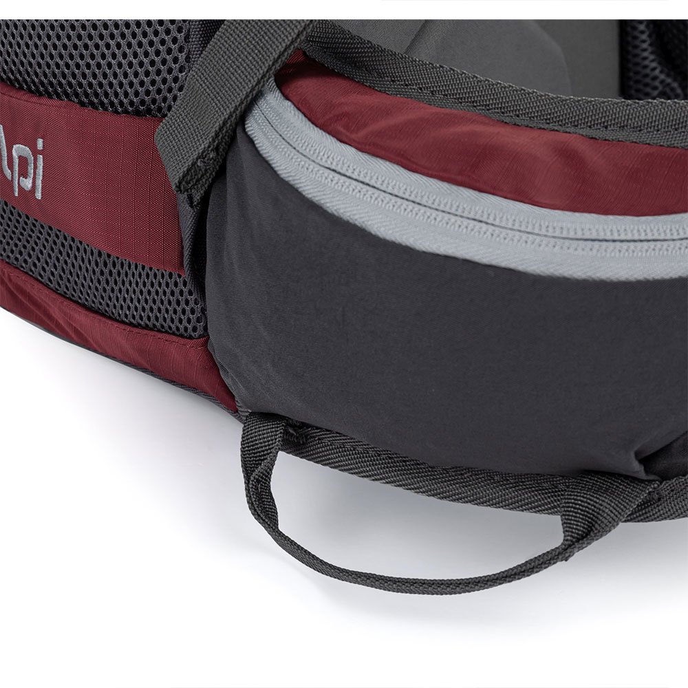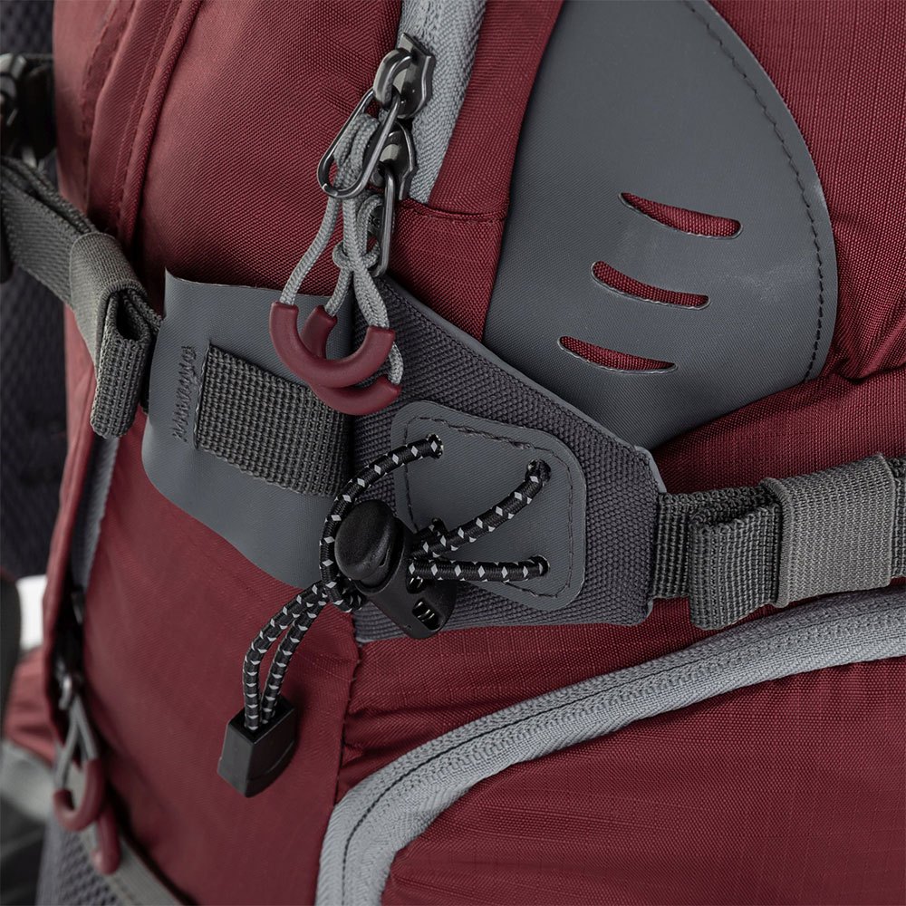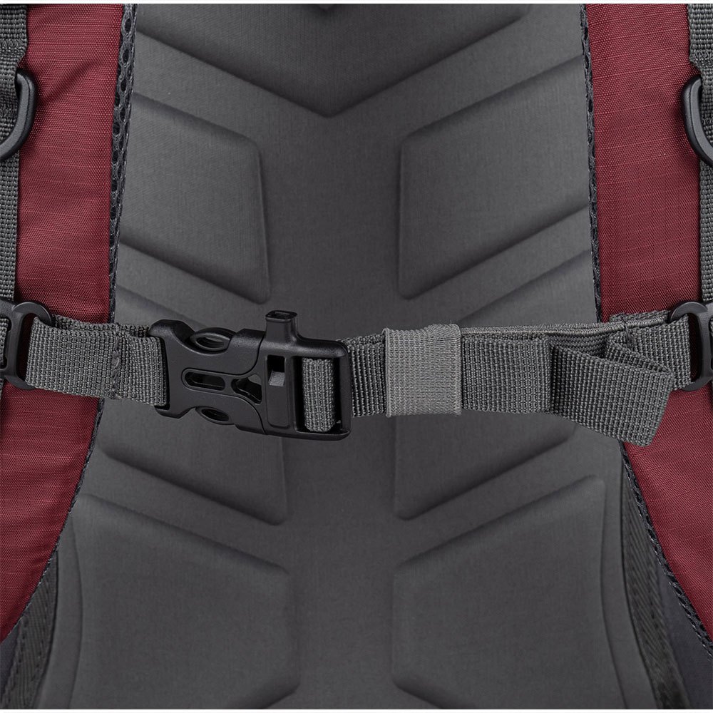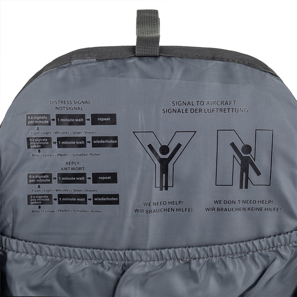 Além disso, uma cinta lombar com fivela grande e uma cinta peitoral com apito sinalizador fixam perfeitamente a posição da mochila.