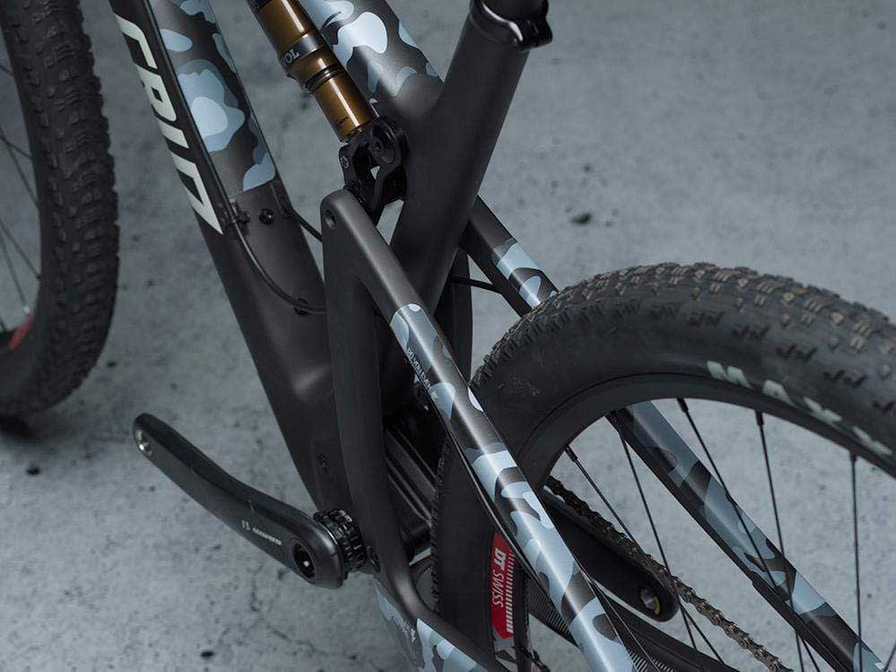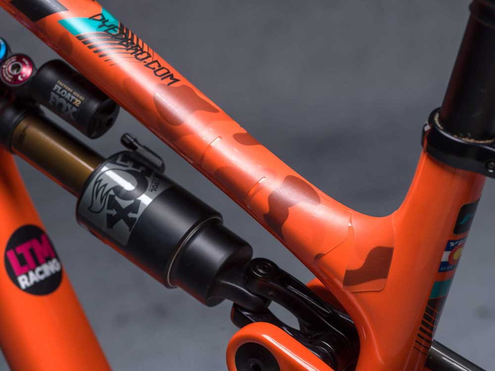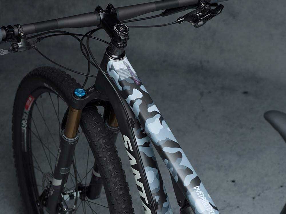 Protetor de armação com padrão de camuflagem impresso. O protetor é transparente para que você ainda consiga ver a cor da sua bicicleta por baixo.