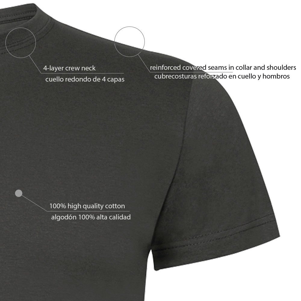 Gola redonda com 4 capas, tapa costuras reforçado na gola e ombros e costuras laterais.