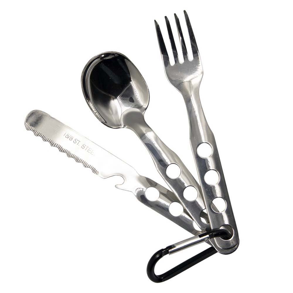 Faca, colher e garfo em aço inox, muito leves, tamanho ideal e com mosquetão que os mantém juntos e facilita o transporte.
