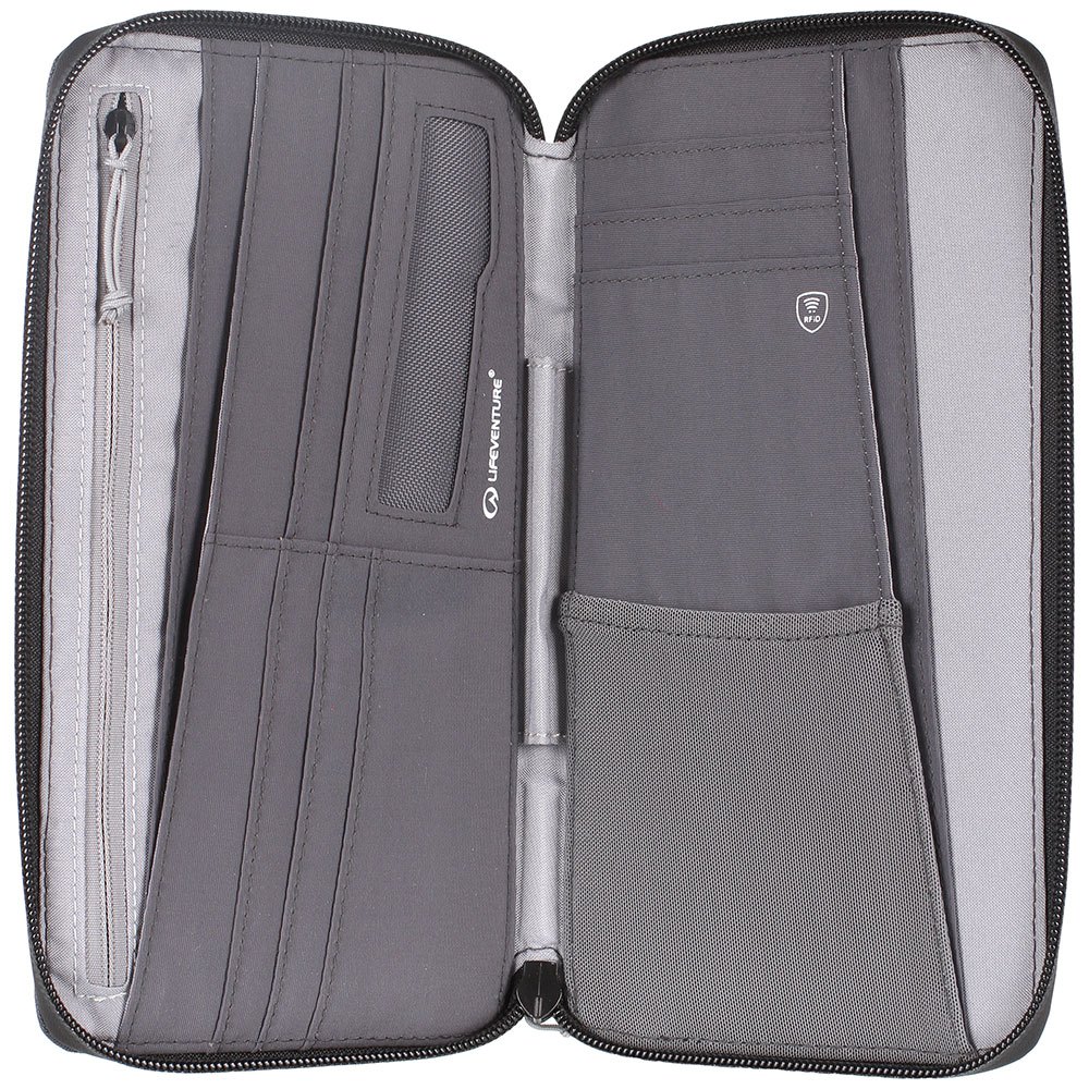 A carteira de viagem protege o conteúdo dos leitores de identificação por radiofrequência (RFiD), interrompendo a transmissão das informações através do tecido de poliéster revestido de níquel e cobre, reduzindo o risco de roubo de identidade. Bolso externo não protegido por RFiD para fácil acesso ao seu cartão de embarque ou bilhetes de viagem.