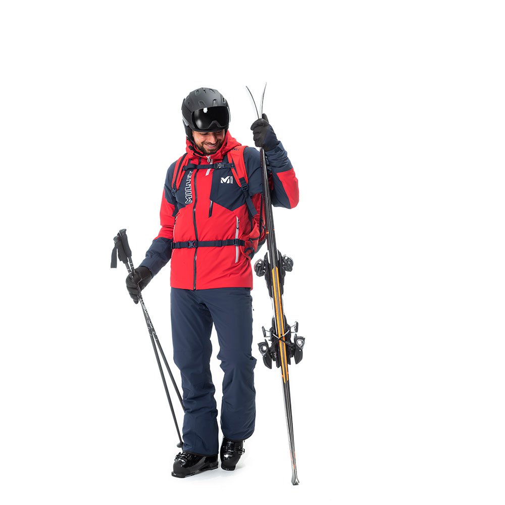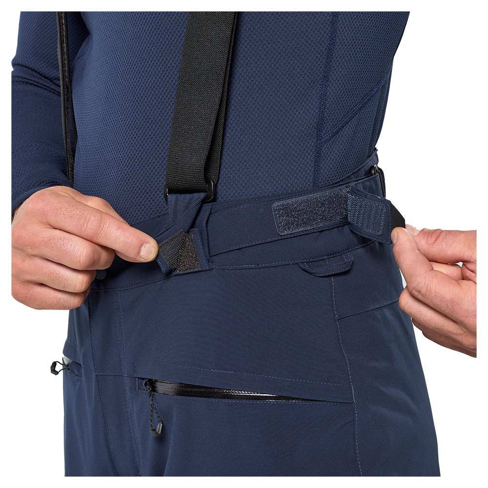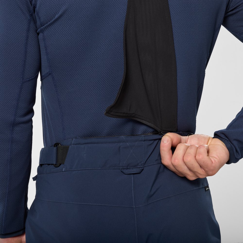 Tecido 2 vias elástico impermeável e respirável, desempenho 10K / 10K sem PFC Tratamento repelente de água DWRTecido facilmente recicladoTodas as costuras seladas Cintura ergonômica com ajuste lateral com velcro Cintas elásticas removíveis e forquilha elástica na parte traseira para maior conforto Aberturas internas para as pernas com zíperes deslizantes duplos 2 bolsos aquecedores de mão com zíper , 1 bolso na coxa Joelhos pré-formados e polainas de proteção Fechos de punho com acesso direto às fivelas das botas para uma mudança rápida para cima / para baixo.