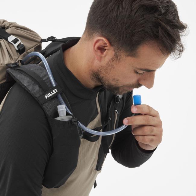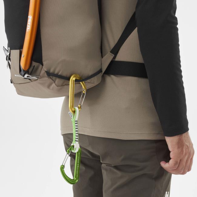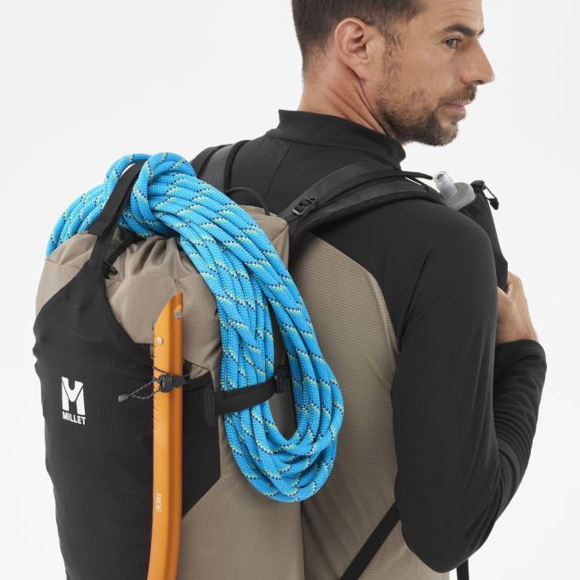 Mochila de montanhismo e escalada da marcaMilletcom capacidade de 25 litros, expansível em mais 5 se necessário.