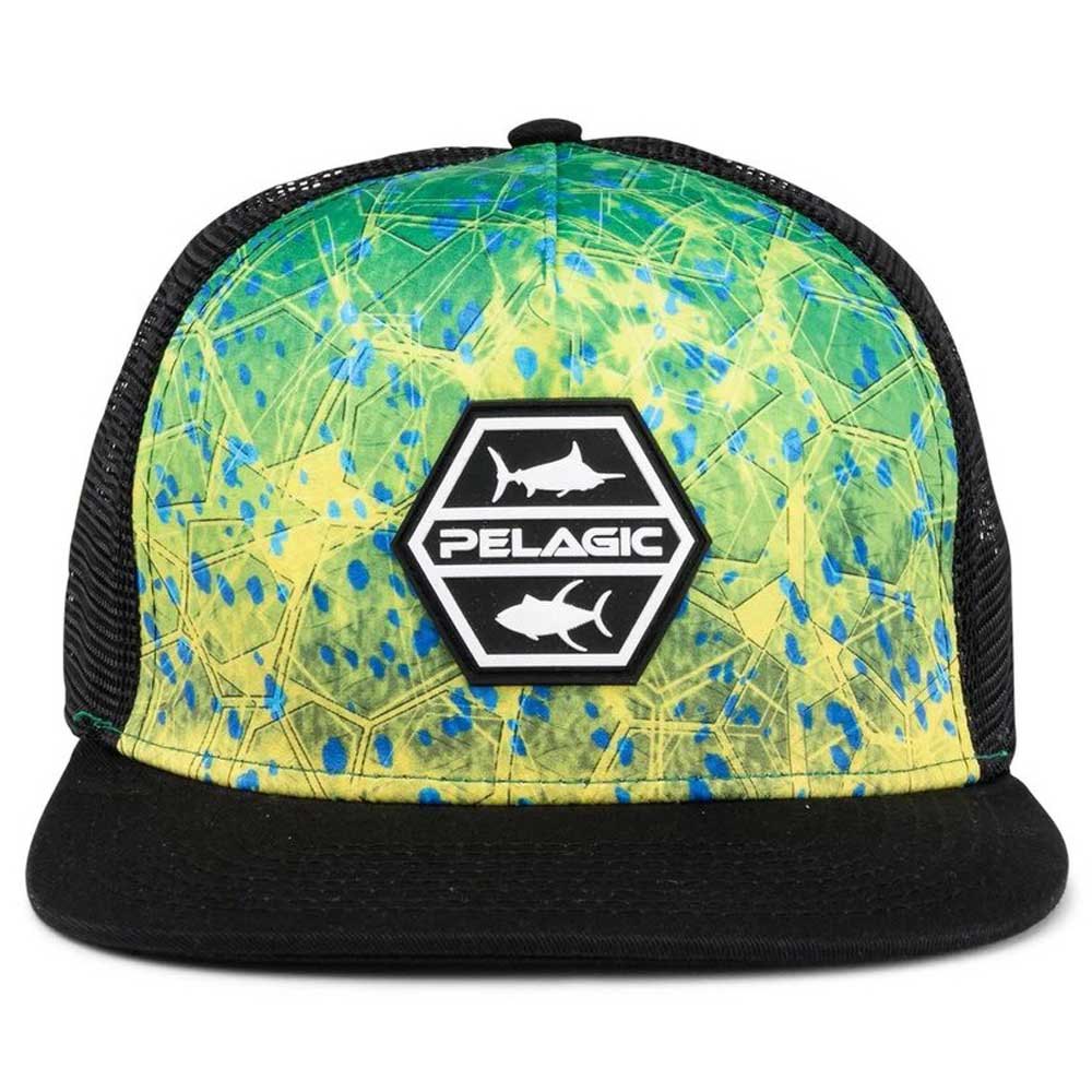 Um boné de tamanho único para todos os estilos de caminhoneiro, o boné Pelagic Alpha Snapback Fishing em Green Dorado Print tem um patch pelágico de borracha Pvc 3 D personalizado no painel frontal e apresenta painéis traseiros de malha ventilada e um fechamento ajustável de Snapback.