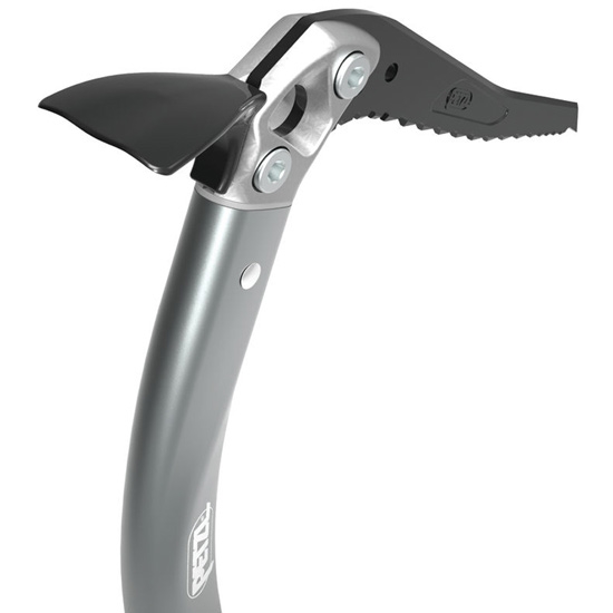 Excelente geometria do machado de gelo, com uma curva estudada para acomodar espaço suficiente ao bater no gelo, mas reta o suficiente para ser usada como bengala de machado de gelo nas aproximações e descidas de nossas subidas.