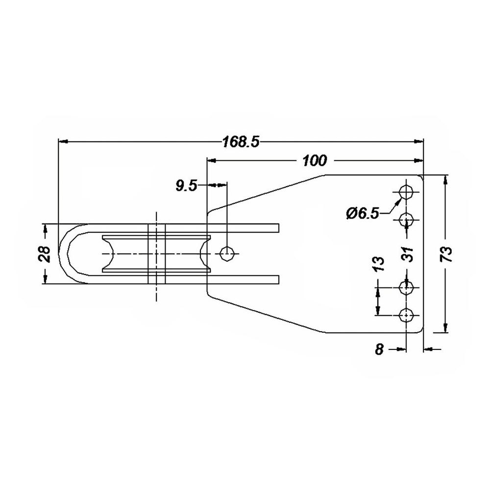 QUADRO A 45 ° + POLIA Material: aço galvanizado (plano 20 x 4mm) Largura total: 168mm Altura total: 73mm 3 orifícios de montagem Ø 6.
