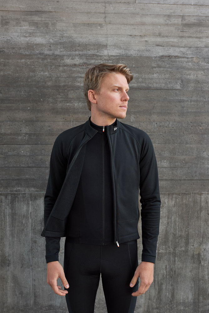 A jaqueta é cortada rente ao corpo e usa um material elástico em quatro direções para maior liberdade de movimento e conforto durante o ciclismo. No entanto, deixa espaço suficiente por baixo para um colete e uma camisa.