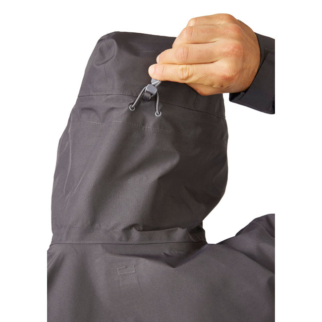 O capuz ajustável bidirecional pode ser apertado com um único puxão da mão e proporciona fácil giro da cabeça com visão desobstruída. Possui também viseira rígida que ajuda a proteger o rosto da chuva. Os punhos ajustáveis de velcro se ajustam perfeitamente às luvas e há dois bolsos para as mãos para aquecer os dedos dormentes nos dias mais frios.