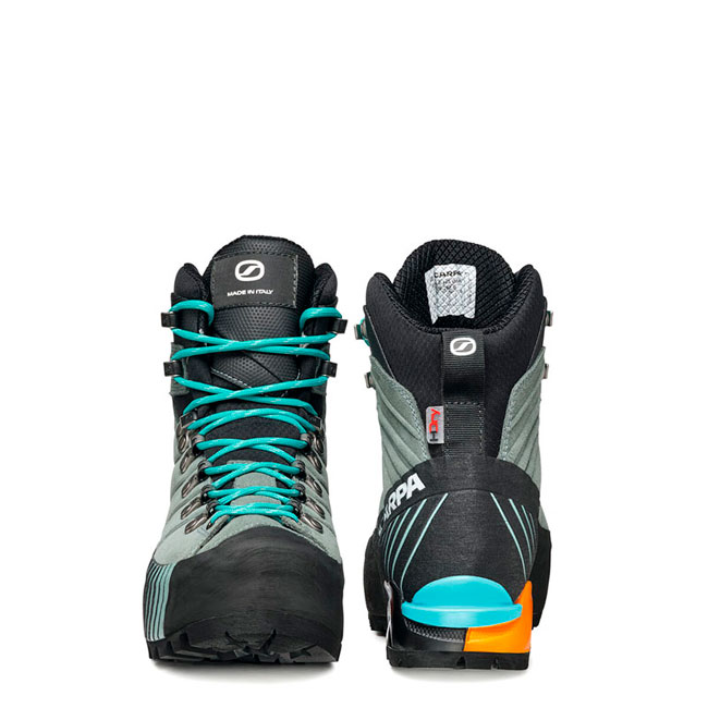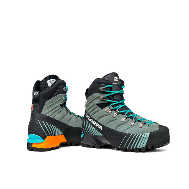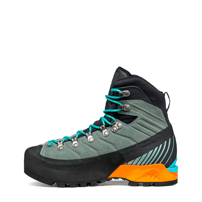 Botas semirrígidas da marca italiana Scarpa para mulheres, voltadas para montanhismo técnico e trekking em terrenos técnicos. Design que proporciona agilidade e proteção em altas montanhas.