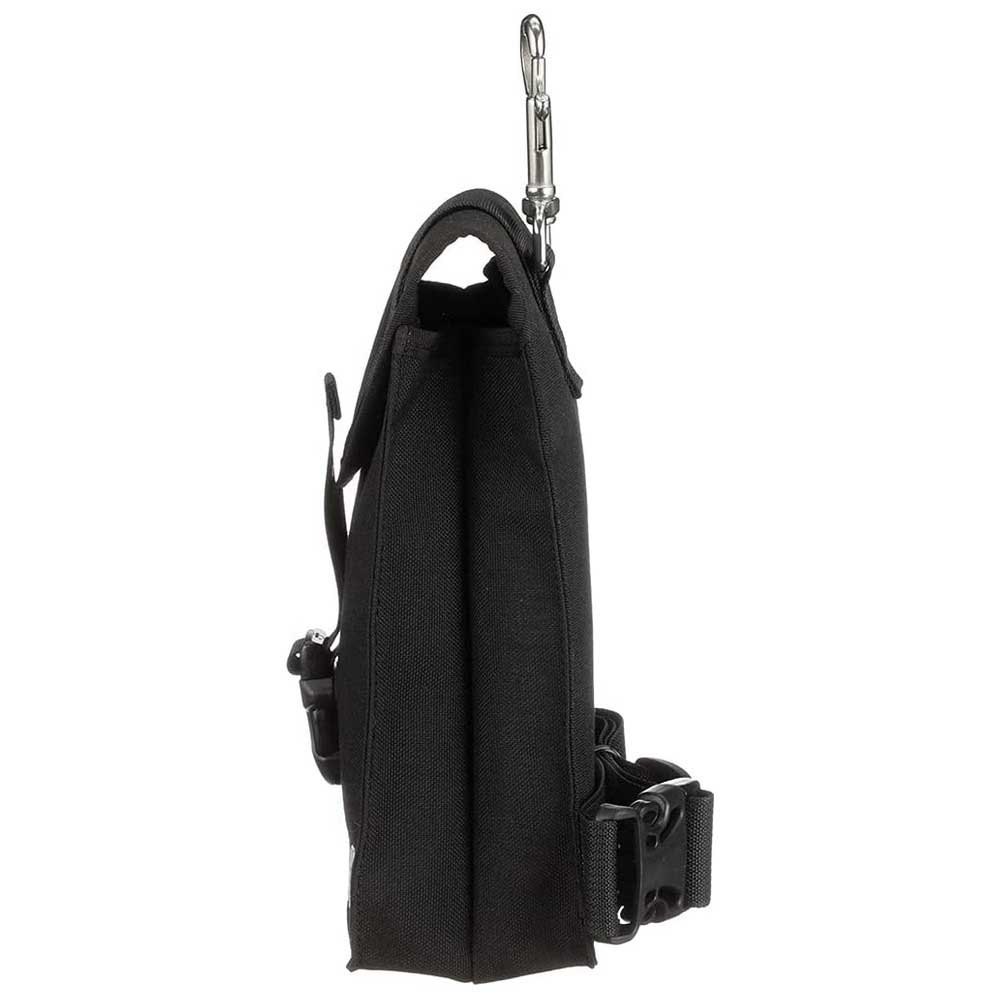 - Uma fivela de aço inoxidável montada em cima se prende a um anel D de cintura, enquanto a alça ajustável na parte de trás segura o bolso à sua coxa.