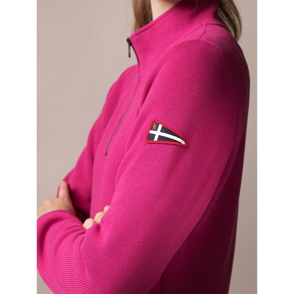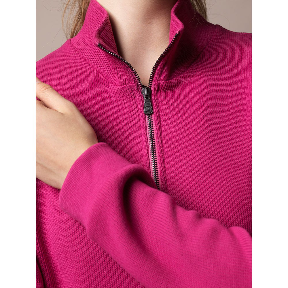 Casaco de malha com fecho de correr até meio para mulher na nossa popular qualidade de malha de Portugal. Bainha aberta e punhos de malha nas mangas. Emblema de bandeira no peito.