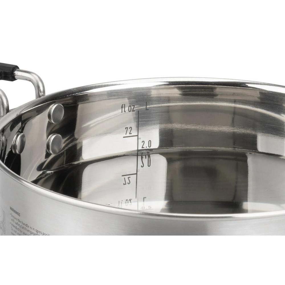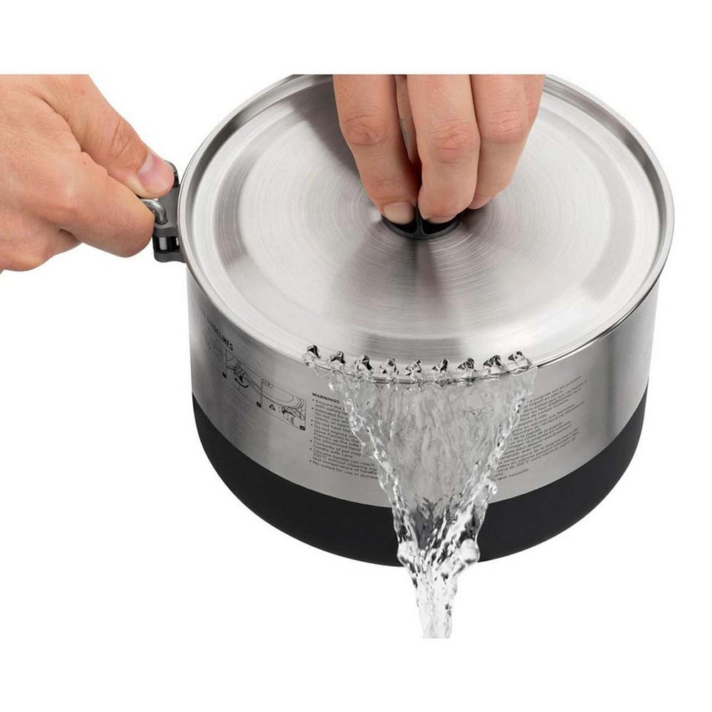Projetado para embalagem compacta e manuseio conveniente, possui uma alça Pivot Lock que trava com segurança no lugar durante o uso e trava quando armazenada. Outros recursos incluem um padrão exclusivo de filtro com fenda para facilitar o fluxo, uma tampa de silicone que se prende ao lado da panela ao cozinhar e uma base que fornece melhor absorção de calor e estabilidade em fogões de acampamento.