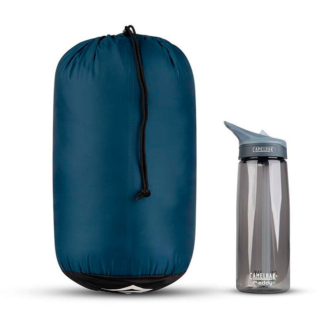 - Tecido externo de náilon 30D com acabamento repelente à água DWR e interno de náilon 20D. Tecidos leves e muito compressíveis.