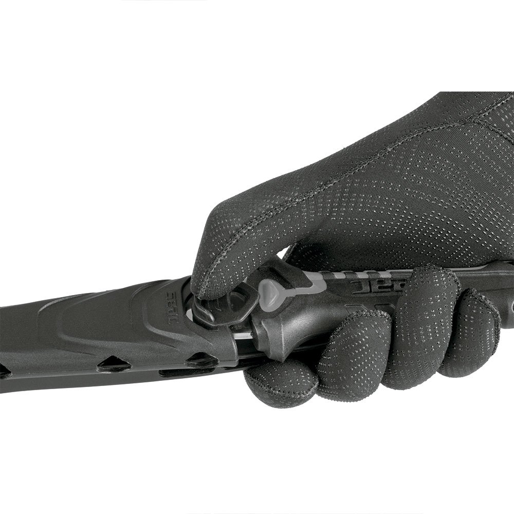Lâmina de aço temperado AISI 420. Forma típica de estilete. Cabo ergonômico de material duplo com martelo de extremidade. Bainha com sistema Easy Lock. Fixação reversível. Pode ser preso ao cinto, braço ou panturrilha.