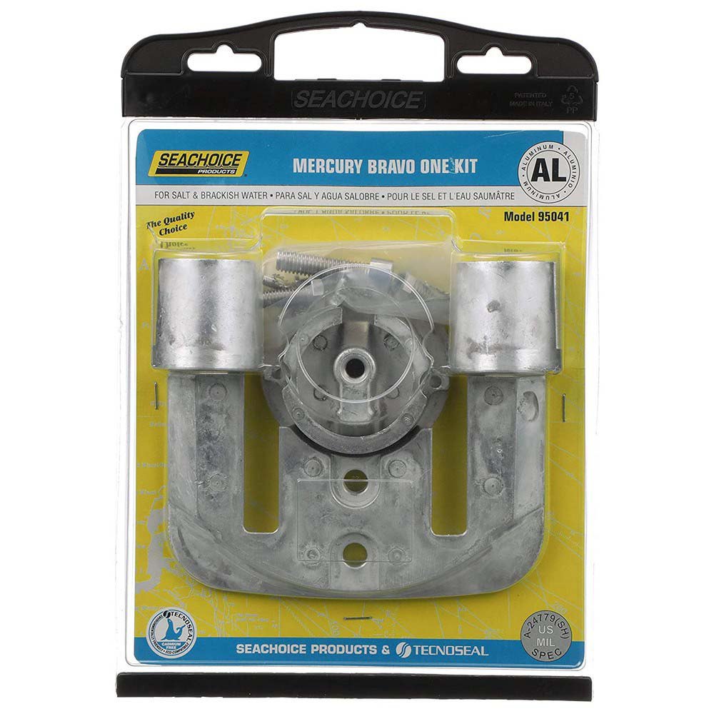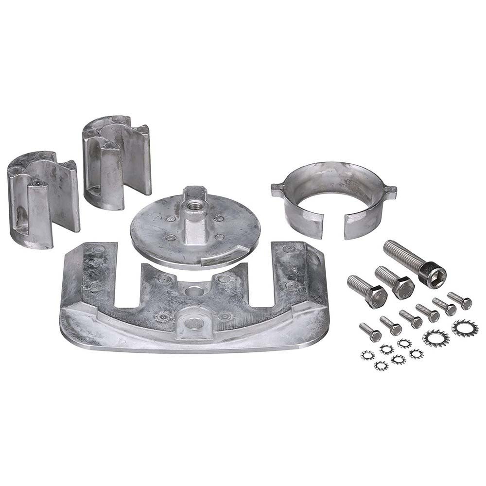 Ânodo de bloco para caixa do cardan (1)Skeg para placa de ventilação (1) Colar do ânodo entre a hélice e a caixa de engrenagens (1)Ânodo do colar para gavetas de compensação (2) Parafusos de aço inoxidável 316.
