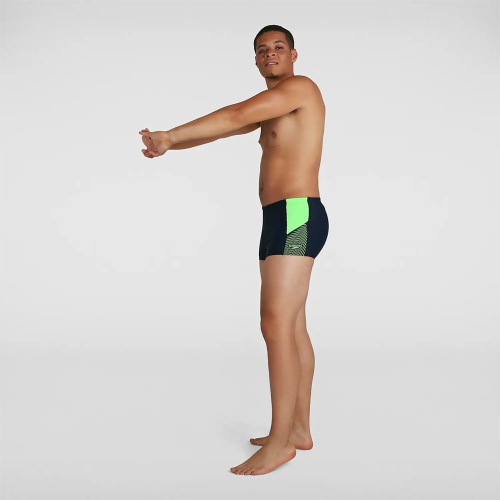 Shorts aqua elegantes e elegantes com inserções laterais lisas em verde brilhante. Os calções têm uma cintura com cordão e são ideais para a natação regular.
