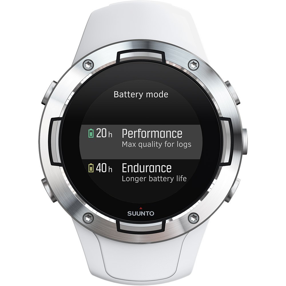 Com os modos de bateria inteligentes do Suunto 5 e a longa duração da bateria de até 40 horas, você não precisa se preocupar com a falta de energia, mesmo em sessões de treinamento ou caminhadas mais longas.