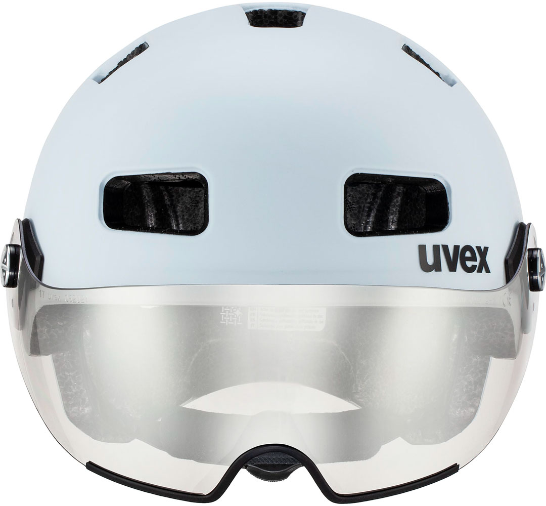 Proteção adicional na selva urbana é fornecida pela área do pescoço de corte profundo. Para melhor visibilidade ao entardecer, a viseira uvex rush é equipada com um LED plug-in e fitas e logotipos refletivos. A viseira para todos os climas com campo de visão estendido em prata litemirror (Cat.1) protege os olhos de maneira ideal do sol, vento e outras influências ambientais no tráfego rodoviário.